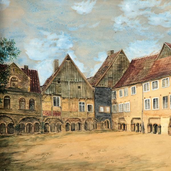 Eine wichtige Funktion der mittelalterlichen Kreuzgänge war es, den Verstorbenen eine letzte Ruhestätte zu bieten. In vielen heute noch erhaltenen Kreuzgängen in Klöstern können Sie daher zahlreiche Grabplatten entdecken, die von den ehemaligen Mitgliedern berichten. Möglicherweise war das Fragment einer Grabplatte, das Sie hier sehen, Teil des Kreuzgangs der Stiftskirche. Die nur noch in Teilen erhaltene Inschrift nennt den Namen der Verstorbenen: Gertrud. Ob es sich dabei um die gleichnamige Äbtissin handelt, die von 1185 – 1207 im Stift lebte, bleibt leider ungewiss.