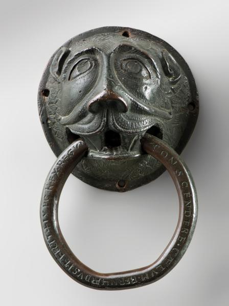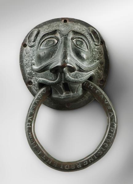 Nahezu unscheinbar, direkt neben einer großen, gut bestückten Vitrine präsentiert, erblicken wir zwei kreisförmige Bronzeobjekte. Beim näheren Betrachten lassen sich zwei Löwengesichter erahnen – zugegeben: Siebenötigen ein wenig Fantasie, um diese als Löwen zu erkennen. Ihr Gesichtsausdruck mit den großen Augen und den zusammengezogenen Brauen ist beinahe schon menschlich. In ihren Mäulern tragen sie jeweils einen Ring, der mit einer Inschrift versehen ist.