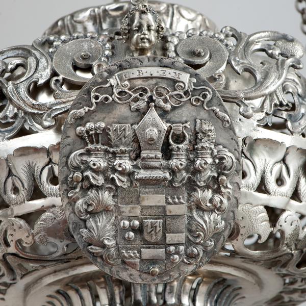Auf Ihrer Augenhöhe sehen Sie vor sich ein großes, silbernes Objekt, das an einer langen Kette hängt. Trotz seiner Größe und dem bauchigen Umfang im oberen Bereich wirkt es filigran. Dies liegt an den durchbrochen gearbeiteten Ornamenten: Sie können an vielen Stellen in das Innere oder die innenliegende Schale des Objektes sehen. Die Pflanzenranken und geschwungenen Ornamente begegnen Ihnen auch an zahlreichen anderen Objekten in der Stiftskammer, da ein Großteil des Kirchenschatzes aus der barocken Zeit stammt.
