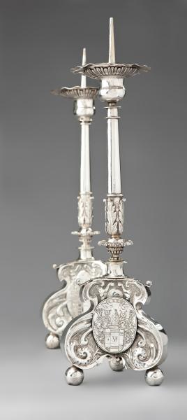 Das Auffälligste an den beiden Stücken, die Sie nun betrachten, ist das imposante Wappen auf dem Fuß der beiden silbernen Leuchter. Es nimmt nahezu die gesamte Fläche in Anspruch und lässt die es umspielenden Ranken deutlich hinter sich zurücktreten.
