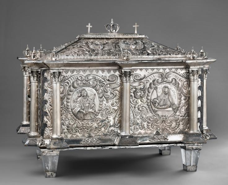 Aber auch in Freckenhorst ist sein Name auf ewig mit der Stiftskirche verbunden. Schließlich stiftete er den großen silbernen Schrein, der die sterblichen Überreste der ersten Äbtissin des Stiftes, Thiatildis, enthält und der noch immer in der Kirche bewundert werden kann. Zusammen mit den beiden hier gezeigten Altarleuchtern und einer sogenannten Votivampel schenkte er der Stiftskirche eine bedeutende Ausstattung.