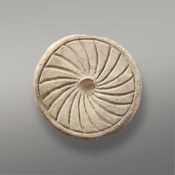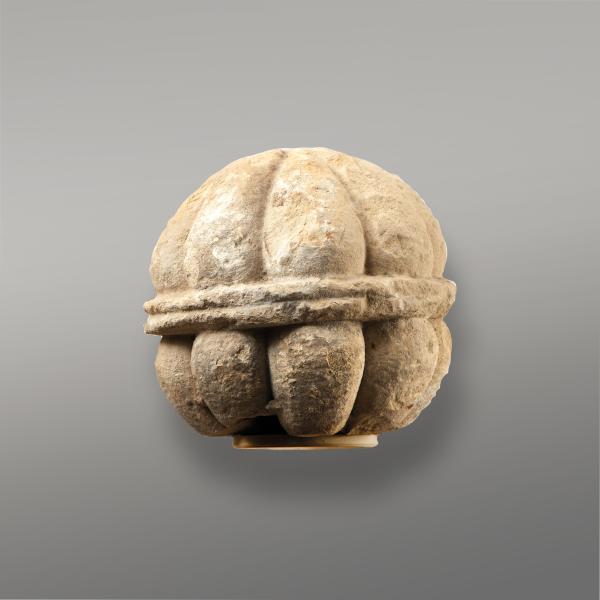 Rund dreihundert Jahre jünger sind die nächsten beiden Bauornamente. Bei dem flachen, kreisrunden Objekt mit strahlenförmiger Verzierung könnte es sich um einen Heiligenschein handeln. Das zweite Ornament scheint eine Art Knauf zu sein. Womöglich diente er als oberer Abschluss eines größeren Einbaus, beispielsweise eines steinernen Grabmals.