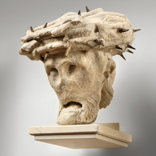 Das letzte Objekt in dieser Reihe lässt sich schließlich eindeutig identifizieren: Es handelt sich hierbei um den Kopf einer Christusdarstellung. Während das Gesicht stark verwittert ist und Einzelheiten kaum noch zu erkennen sind, hat sich die Dornenkrone deutlich besser erhalten. Die feinen Gesichtszüge und die lebhaft gearbeitete Bartstruktur zeugen von einem hohen, künstlerischen Können. Leider konnte dieses Objekt bisher keinem Künstler oder einer Werkstatt zugeordnet werden.