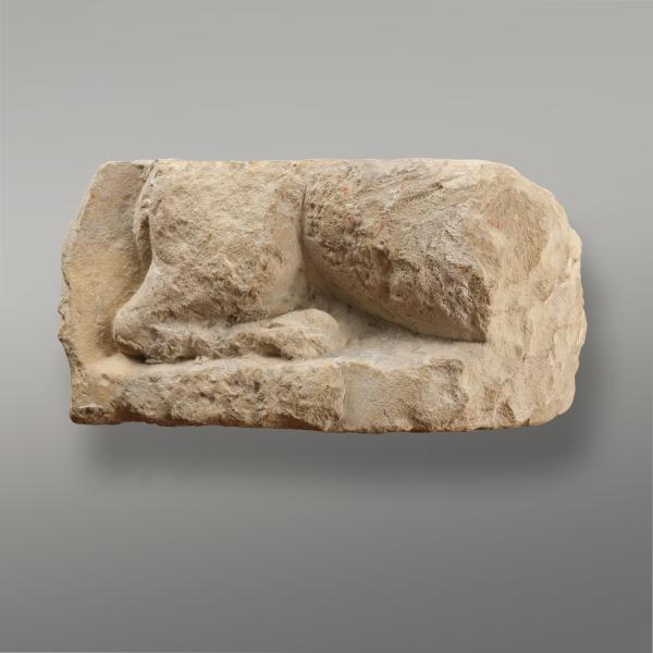 Das stark fragmentierte Relief zeigt die Reste eines liegenden Löwen. Erhalten geblieben sind von dem ursprünglich mehr als einen Meter langen Bauteil lediglich der Ansatz eines Bauches und das rechte Hinterbein. Löwen standen in der mittelalterlichen Bildwelt stellvertretend für verschiedene Menschen aus der Bibel. Er war zum einen Symbol für Christus als Oberhaupt des Volkes Juda und Versinnbildlichung seiner Stärke. Zum anderen stand er für den Evangelisten Markus oder begleitete diesen.
