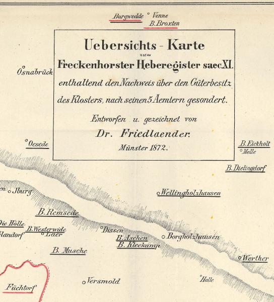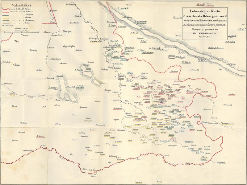 Die vor Ihnen liegende Karte zeigt eine Übersicht des Münsterlandes aus dem Jahr 1872. Die Beschriftung oben rechts gibt Auskunft darüber, dass auf dieser Karte alle zum damaligen Kloster Freckenhorst gehörigen Güterbesitze, also Höfe, eingezeichnet sind. Diese Höfe sicherten den Unterhalt des Klosters und seiner Bewohnerinnen, der adligen Stiftsdamen, durch die Zahlung von Abgaben.