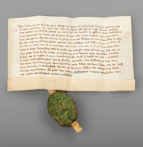 Diese Gründungsurkunde sehen Sie hier vor sich liegen. In dieser wird festgelegt, dass diese Bruderschaft zweimal jährlich Geld für den Unterhalt erhält. Außerdem stiftet die Äbtissin noch einige Schillinge jährlich für Kerzen, die anlässlich des Gedenkens zum Heiligen Kreuz, der Heiligen Jungfrau Maria und des Heiligen Bonifatius aufgestellt werden sollen.