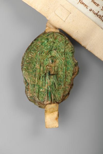 Um die Rechtskräftigkeit des Dokumentes zu wahren, hängte die Äbtissin ihr Siegel an die Urkunde. Es zeigt sie selbst aufrechtstehend in einer mittelalterlichen Architektur. In ihren Händen hält sie ein Buch sowie einen Palmwedel.