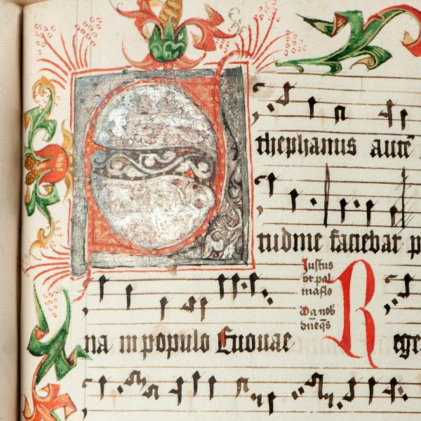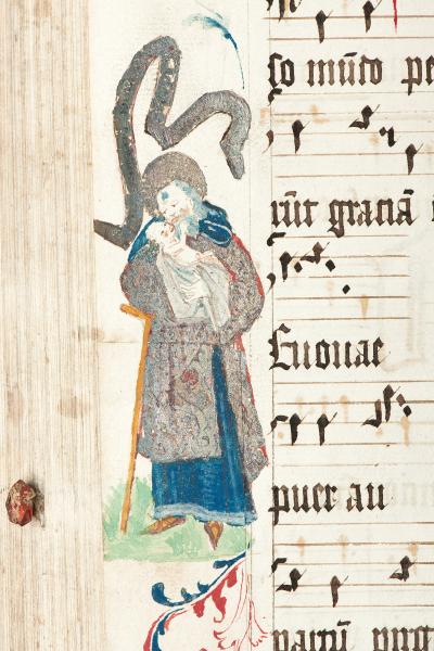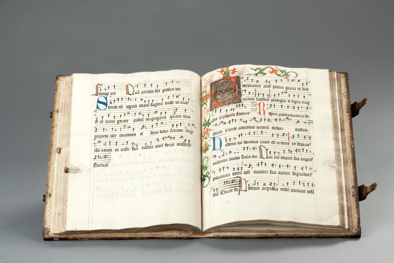 Das vor Ihnen liegende Exemplar ist ein sogenanntes Antiphonar – auch als Antiphonale bezeichnet. Es enthält alle Melodien und Texte sowie Psalmen und Hymnen der Stundengebete. Damit ist das Antiphonar Teil einer Reihe von Handschriften, die uns noch heute von dem geregelten Ablauf in den Klöstern und Kirchen berichten. So gab es Bücher für die Lesungen (Lektionar), für die Texte der Evangelisten (Evangeliar), für die liturgischen Gesänge der Messfeier (Graduale) oder eben für die Wechselgesänge des Stundengebetes (Antiphonar). Einige davon können Sie noch heute in der Stiftskammer bewundern.