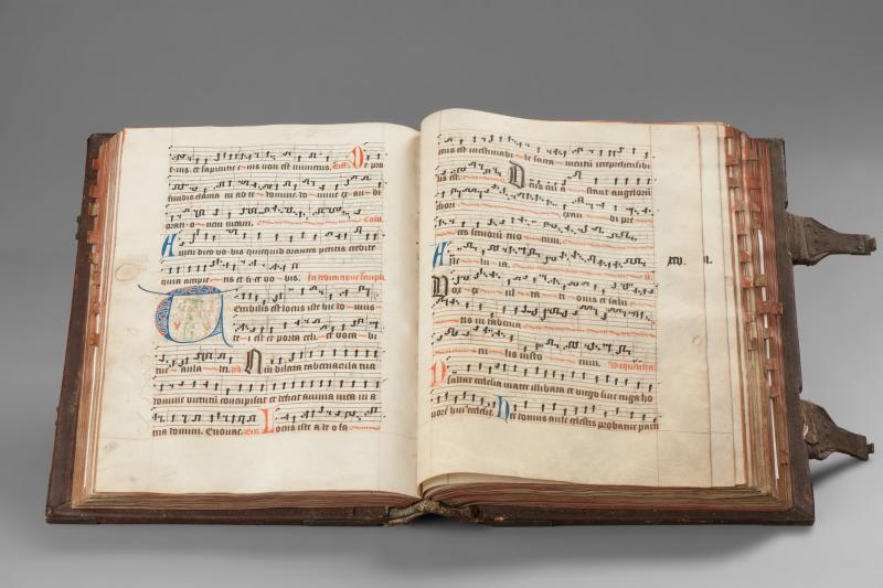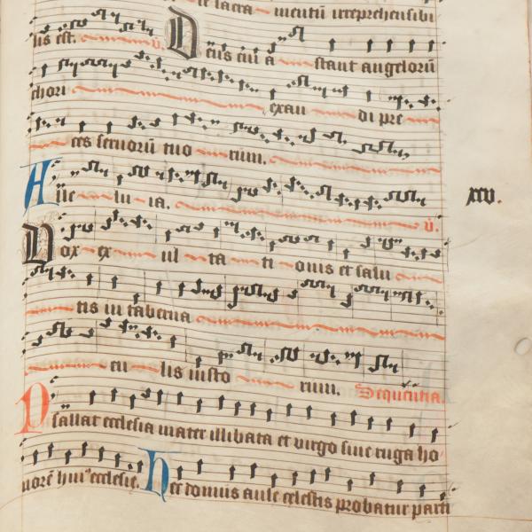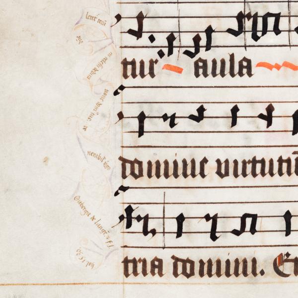Fast 500 Jahre alt ist die nun vor Ihnen liegende Handschrift. Die aufgeschlagene Doppelseite zeigt eindrücklich, wie viel Kunst in solchen alten Handschriften steckt. Da ist zum einen das saubere und sehr akkurate Schriftbild. Darüber befinden sich die einzelnen Noten des Musikstücks, die sich gänzlich von dem Aussehen heutiger Noten unterscheiden. Das liegt daran, dass die quadratischen Notenköpfe leichter mit den Federkielen geschrieben werden konnten als unsere heutigen kreisförmigen.