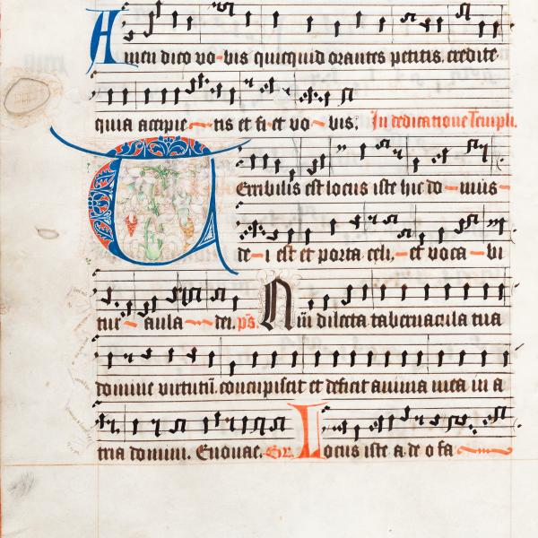 Zum anderen wurden die Anfangsbuchstaben von Wörtern eines neuen Satzanfangs durch die Verwendung von Farbe und kleinen Malereien nochmals hervorgehoben. Auf der linken Seite können Sie dies am großen „T“ beobachten: In der mittigen Freifläche befinden sich zarte Blumenköpfe, die durch Ranken miteinander verbunden sind. Wenn Sie der oberen Linie des „T“ nach links folgen, sehen Sie ein weiteres Detail, das die kunstvollen Handschriften auszeichnete. Fehlstellen im Pergament wurden nicht verdeckt, sondern in die Malerei mit einbezogen.