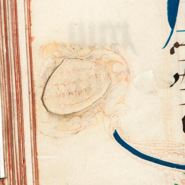 Für die Herstellung solch prachtvoller Handschriften waren in unserer Region die Fraterherren aus Münster bekannt. Auch im Graduale finden wir darauf einen Hinweis: In den zarten Girlanden, die Sie seitlich am Rand erkennen können, befindet sich die Inschrift "F. J. Hol. 1530". Die Ausmalungen weisen auf den Frater Johannes Holtmann hin, der den Fraterherren in Münster angehört hat. Den Auftrag für die Handschrift erhielten er und seine Brüder von der Freckenhorster Stiftsdame Oitberga von Langen.
