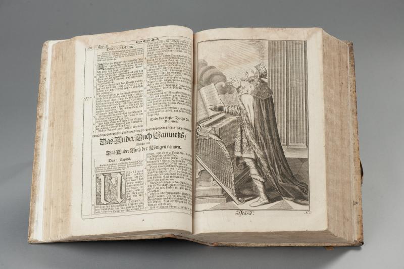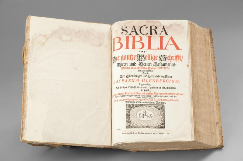 Zu der umfangreichen Bibliothek des Freckenhorster Stiftes gehört auch die vor Ihnen liegende Sacra Biblia – die gantze heilige Schrift aus dem Jahr 1701. In ihrer ersten Auflage wurde sie 70 Jahre zuvor von Caspar Ulenberg herausgegeben, der ein bedeutender katholischer Theologe und Bibelübersetzer war. Zahlreiche kleine Kupferstiche sind kennzeichnend für die Erstauflage. Die Freckenhorster Version hingegen weist wenige, dafür ganzseitige Kupferstiche auf, die wichtige Propheten oder andere biblische Personen zeigen.