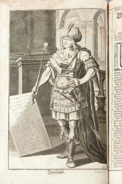 Gestochen wurden diese von Engelhard Nunzer, einem deutschen Kupferstecher, der insgesamt 25 ganzseitige Abbildungen für diese Ausgabe angefertigt hat. Die dargestellten Personen weisen die typische barocke Formensprache auf: kunstvoll gelockte Bärte und Haare sowie weite gebauschte Gewänder, die schon fast ein Eigenleben führen. Hinter ihnen, ebenfalls typisch für diese Zeit, erstrecken sich Landschafts- und/oder Architekturdarstellungen.