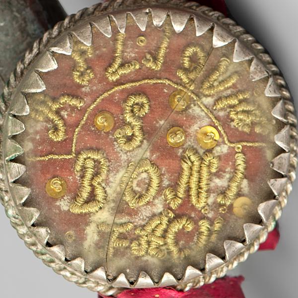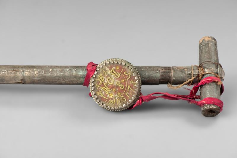 Der vor uns liegende Holzstab erinnert in seiner Form an einen gewöhnlichen Wanderstab. Durch den oberen geraden Abschluss ließe er sich gut greifen. Dass dieser Stab aber eine wichtige Bedeutung haben muss, zeigt sich in seiner kostbaren Aufmachung: Er ist gänzlich mit einem Silberblech beschlagen. Es ist so dünn, dass schon einige Teile verloren gegangen sind. An dem Stab ist ein Anhänger befestigt, der unter dem Bergkristall eine gestickte Inschrift offenbart: „RELIQUIAE S:BONIFATII“.