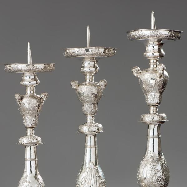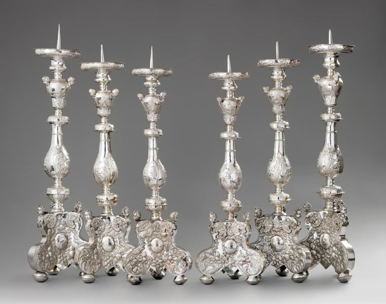 Gleich sieben silberne Objekte sehen Sie nun vor sich. Es handelt sich hierbei um ein Altarkreuz und sechs dazu passende Leuchter. Ihre Zusammengehörigkeit zeigt sich bei den reich dekorierten und geschwungen ausgeführten Sockeln, die allesamt auf kleinen Kugelfüßchen stehen. Bei den Leuchtern setzt sich die reiche Dekoration mit kleinen Engelsköpfen und Pflanzenranken am Schaft weiter fort.
