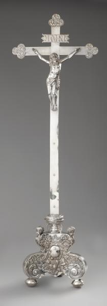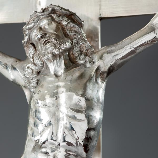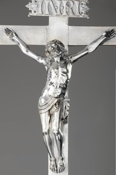 Das Altarkreuz hingegen ist fast schon auffallend schlicht gehalten. Dafür ist jedoch die Figur des am Kreuz gestorbenen Christus besonders eindrucksvoll: Der gesamte Körper ist so fein modelliert, dass die einzelnen Haar- und Bartsträhnen, die Fußnägel und die kleinen Äderchen an den Armen zu erkennen sind. Sogar das an den Armen herabrinnende Blut hat der Silberschmied Bartholomäus Kernitz in der kleinen Arbeit verewigt, die noch nicht einmal 30 cm misst.