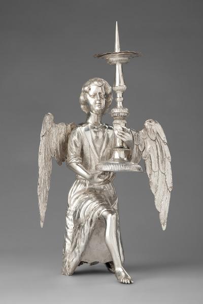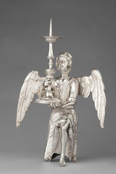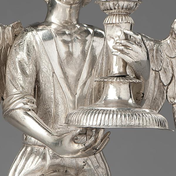 Erst bei näherer Betrachtung zeigt sich die sorgfältige und detaillierte Bearbeitung des silbernen Metalls, die der Silberschmied Bartholomäus Kernitz meisterhaft beherrschte. Fein punzierte Ranken und exakt modellierte Falten überziehen die gesamte Kleidung der Engel und vermitteln so den Eindruck von echtem Stoff. Auch bei den Flügeln lässt sich jede einzelne Feder erkennen.